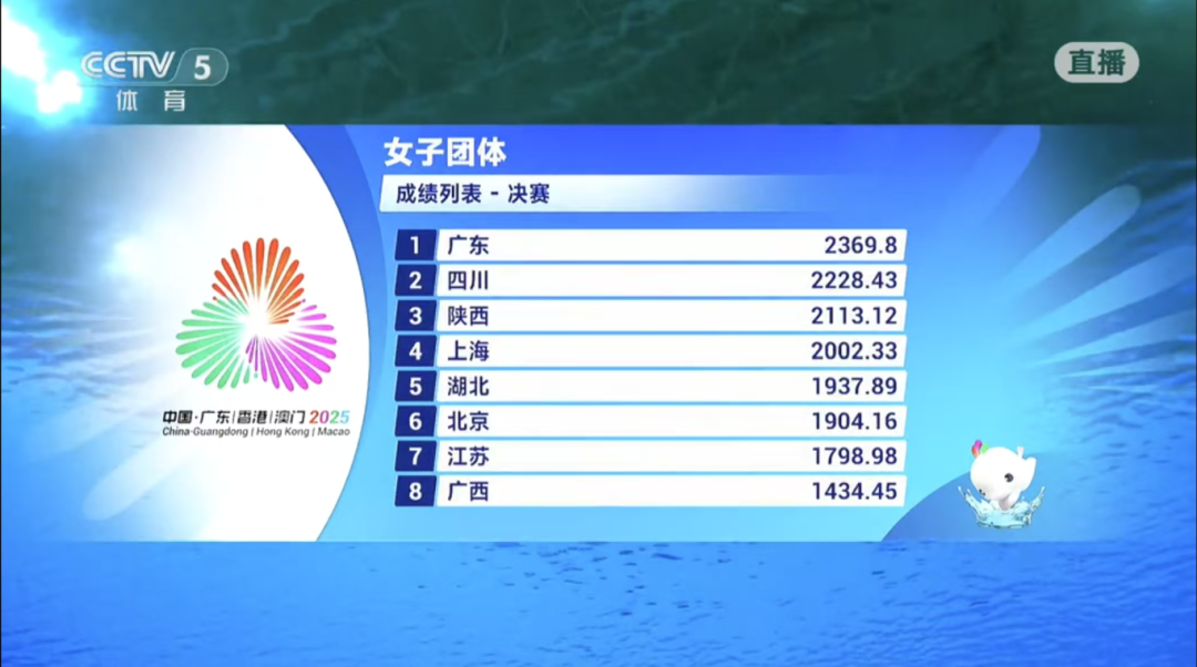 最终,广东队以总分2369.80分夺得十五运会跳水比赛女团金牌。