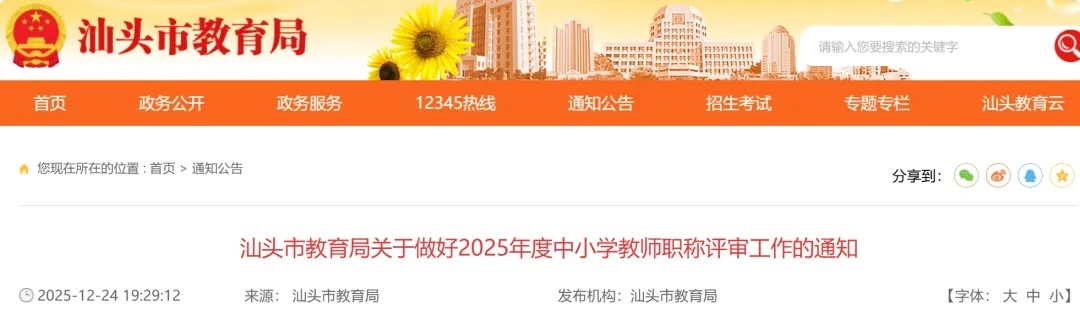 根据《广东省教育厅关于做好2025年度中小学教师职称评审工作的通知》和《关于做好2025年度我市职称评审工作的通知》(汕人社发〔2025〕14号),为做好我市2025年度中小学教师职称评审工作,现就有关事项通知如下: