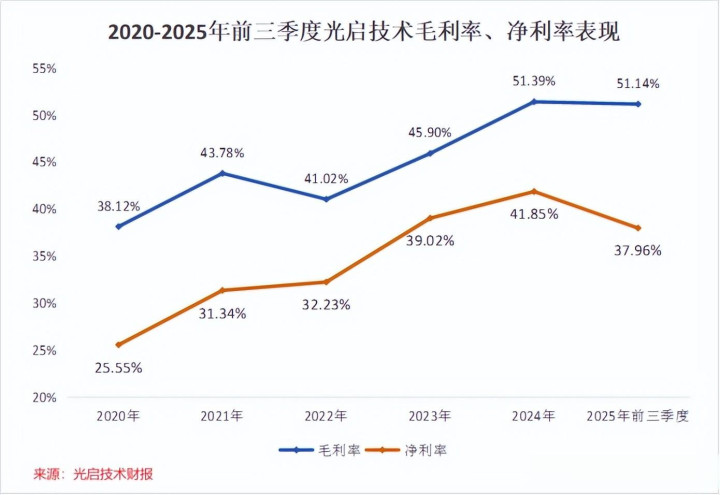 产业链一体化再叠加规模化降本,光启技术的盈利能力表现不凡。从2020年到2025年前三季度,公司毛利率从38.12%大增至51.14%,大涨13个百分点;同期净利率从25.55%大增至37.96%,每100元收入赚的钱上涨了约50%。这种盈利能力的显著提升,充分体现了产业链一体化战略和规模化生产带来的巨大优势,使光启技术在市场竞争中更具价格优势和利润空间。
