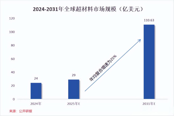 2024年,航空装备行业经历了一段短暂的收缩期,但随后便迅速踏上了恢复元气的征程。随着全球经济的逐步复苏和科技的不断进步,航空装备行业迎来了新的发展机遇。其中,超材料作为航空装备领域的关键材料之一,其市场需求呈现出爆发式增长的态势。据权威机构预测,超材料的全球市场规模在2031年有望达到110.63亿美元,2025年至2031年的年均复合增速为25%,市场前途一片光明。